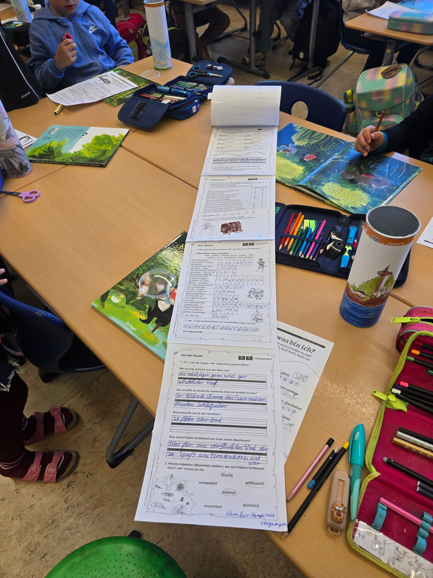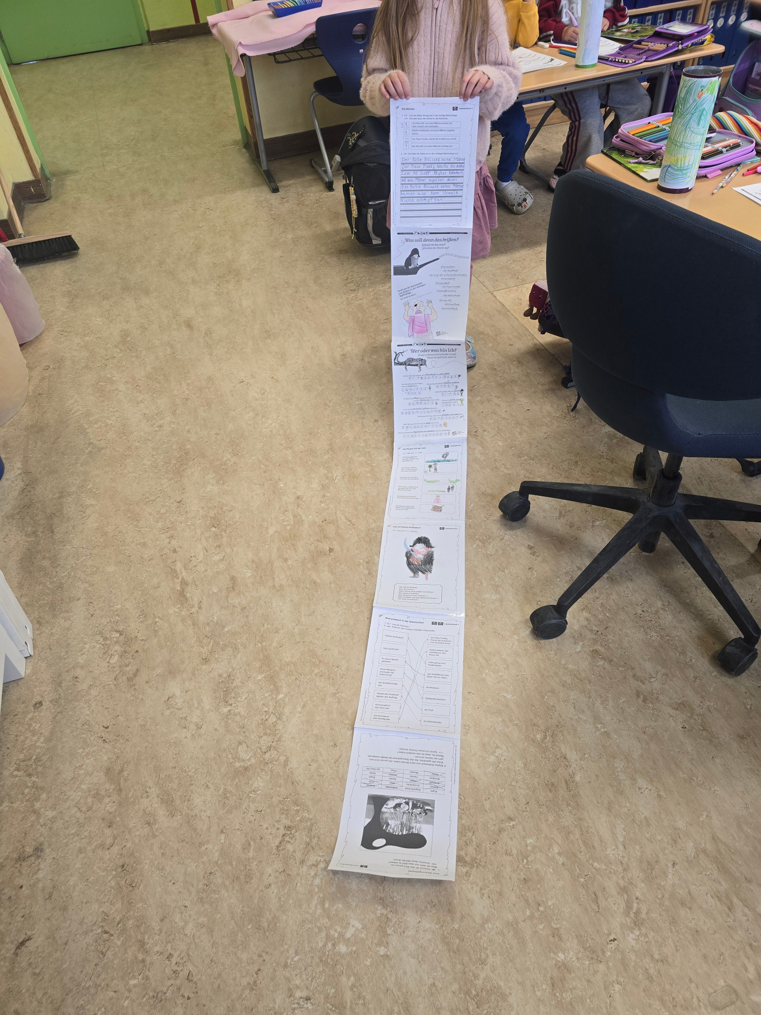 Eine Leserolle ist eine kreative Methode der Leseförderung, bei der die Schülerinnen und Schüler der Lerngruppe A bei uns zum gewählten Buch „Käpten Knitterbart“ Aufgaben im April bearbeiteten. Die Ergebnisse wurden zu einer langen Papierrolle zusammengeklebt und in einer gestalteten Dose (Chipsdose) aufbewahrt. Sie dient der Vertiefung des Textverständnisses, fördert die Selbstständigkeit und diente als Basis für die Präsentation.